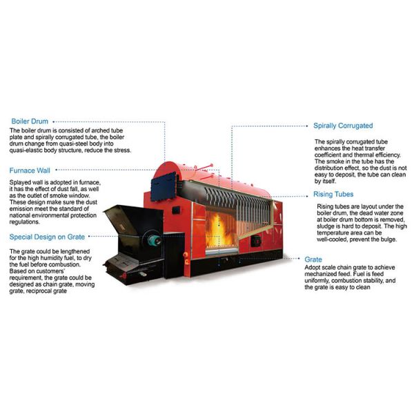 4. Big combustion room design: increase furnace heating area, decrease boiler size, and reduce the emission of the Nox Corrugated hearth make the boiler safer.